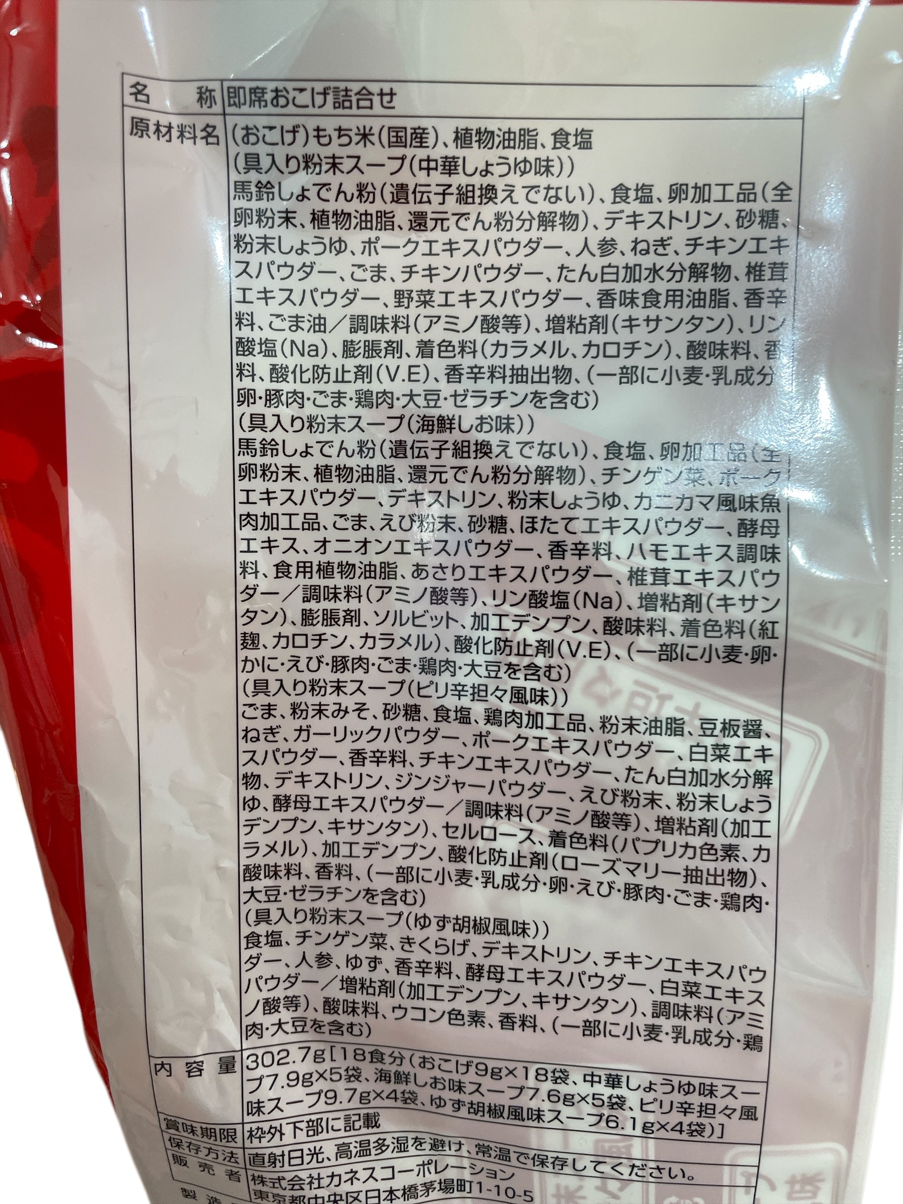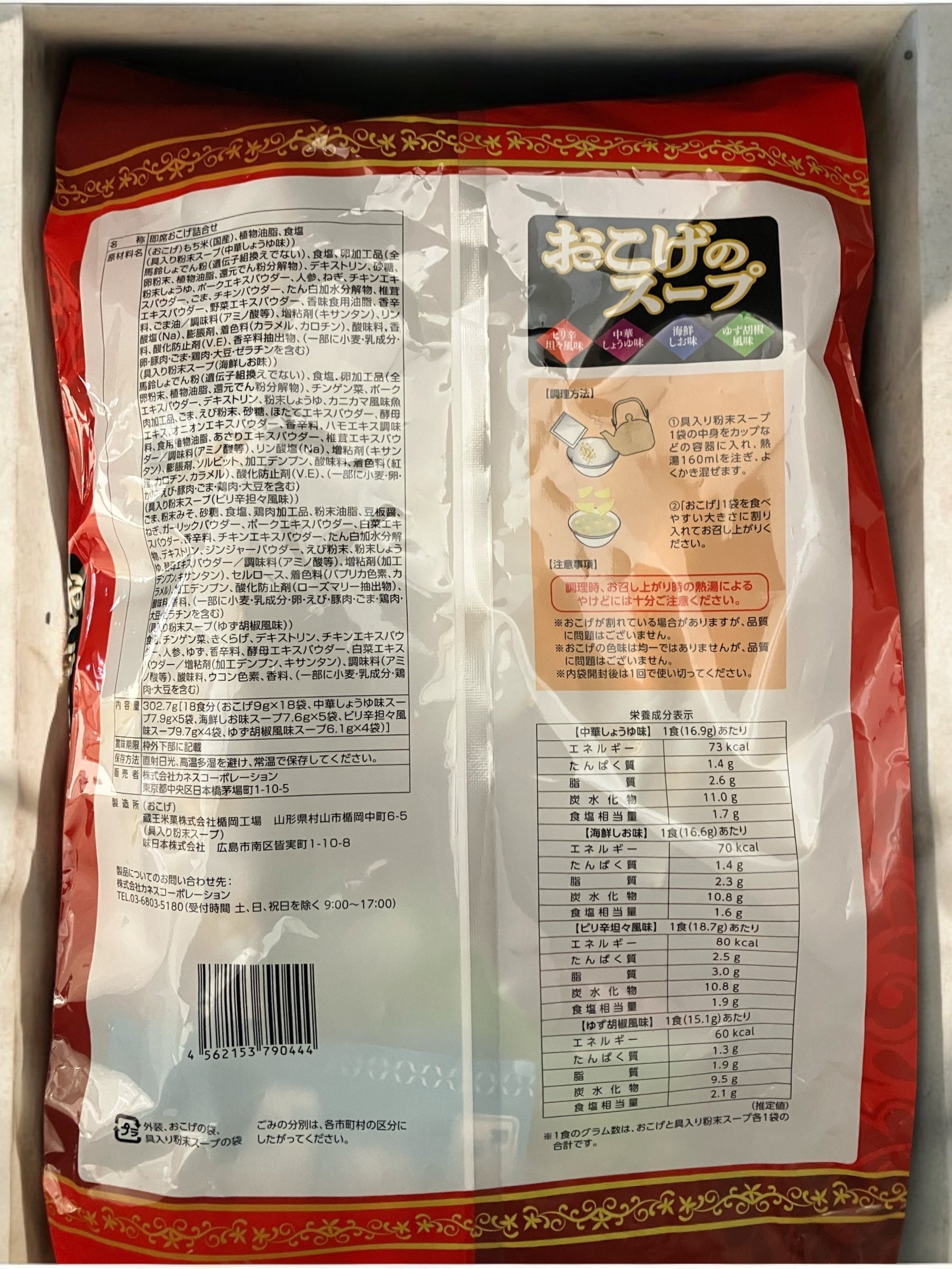 ピリ辛坦々風味、中華しょうゆ味、海鮮しお味、ゆず胡椒風味の4フレーバーが入ったおこげスープ18食入りのセットです。とろみのある4種類のスープとサクサク香ばしい国内産もち米使用のおこげの組み合わせが◎