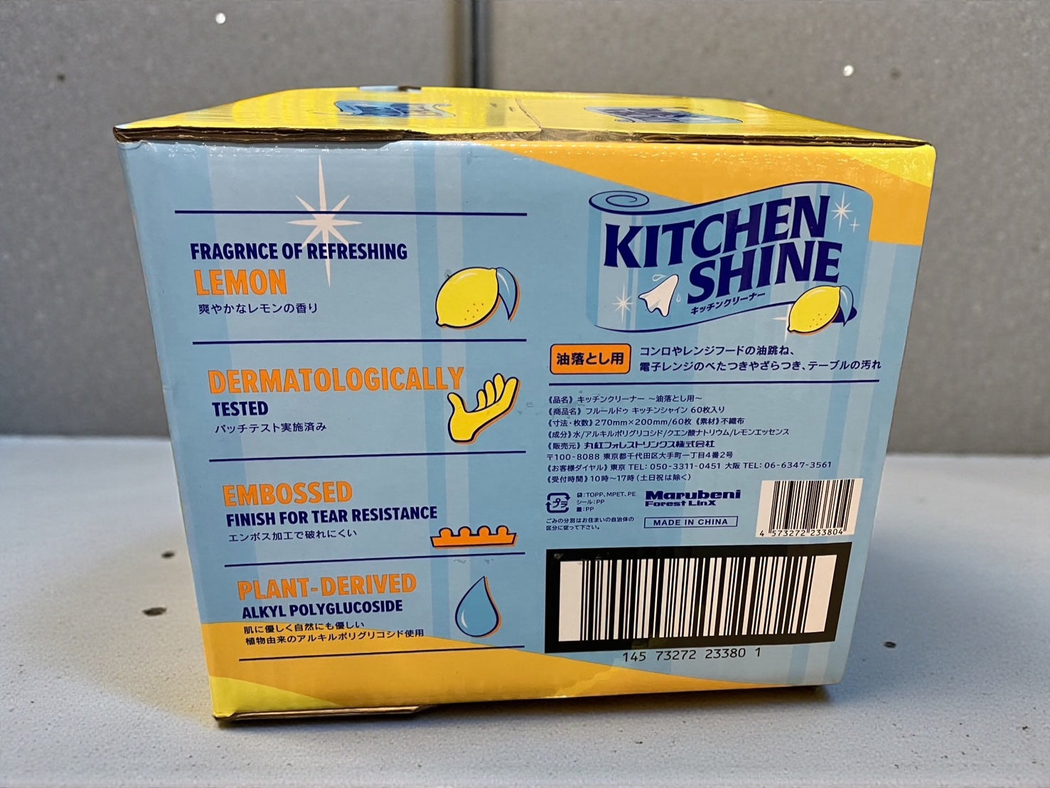 フルールドゥ キッチンシャイン キッチンクリーナーワイプは、頑固な油汚れを素早く落とす強い味方です。厚手で大判サイズ(27cm×20cm)だから、1枚でキッチンの様々な汚れをしっかり拭き取れます。エンボス加工により汚れが掻き出しやすく、効率的なお掃除を実現します。 主成分のブドウ糖由来アルキルポリグリコシドは皮膚刺激性が非常に低く、肌にも環境にも優しい処方。さわやかなレモンの香りでキッチンを爽やかに保ちます。二重蓋付きの個包装パックで乾燥を防ぎ、いつでも湿った状態で使用可能。60枚×4パック(合計240枚)の大容量で、毎日のキッチンクリーニングに最適です。