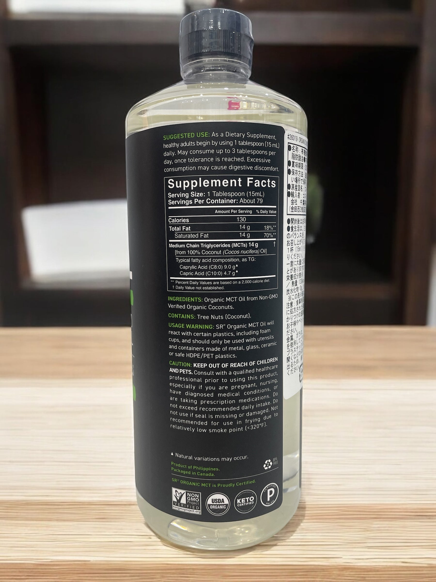 スポーツリサーチ(SR) オーガニックMCTオイルは、有機ココナッツ100%由来のオーガニック ココナッツオイルです。消化吸収がよい中鎖脂肪酸(MCT)