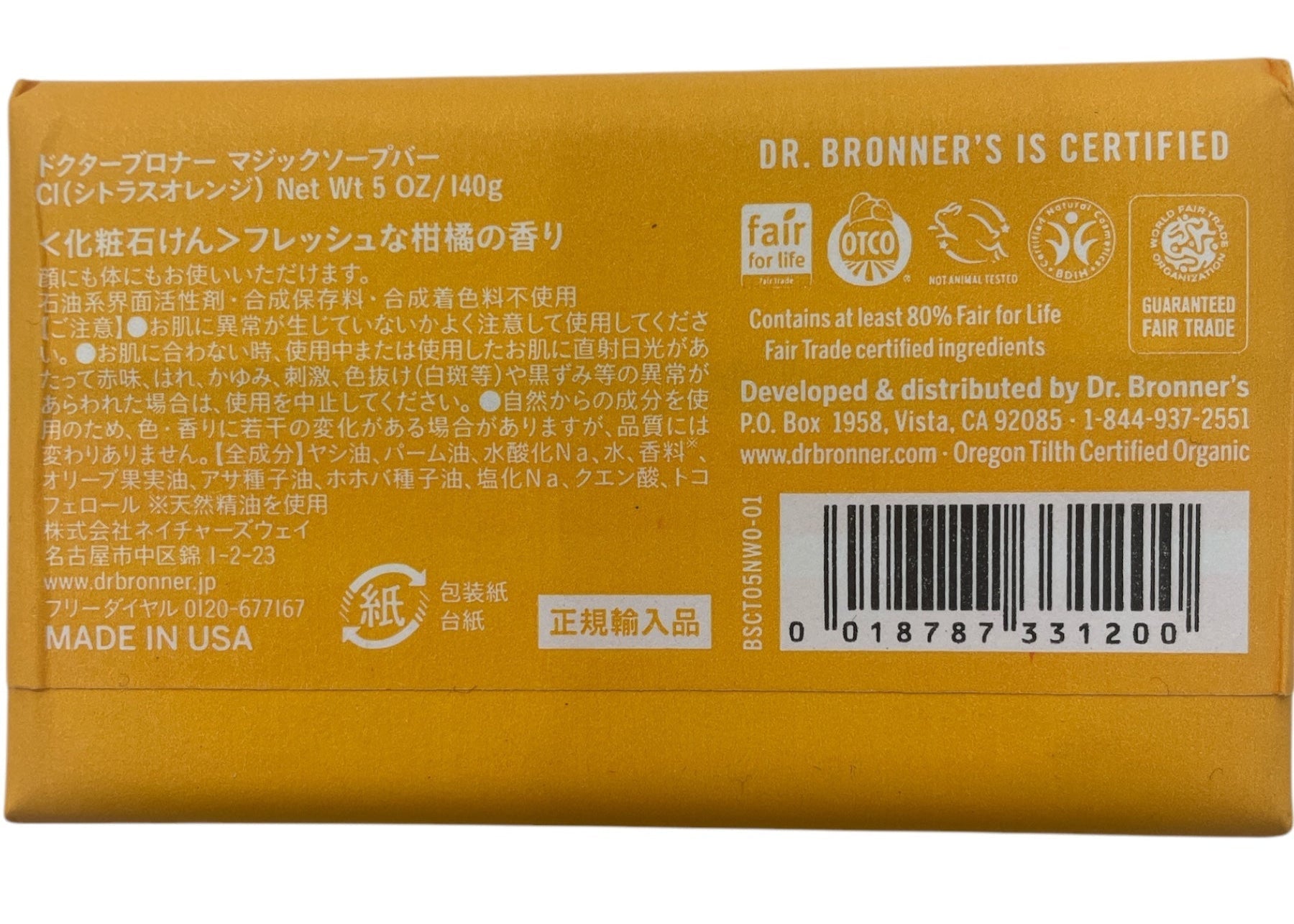ドクターブロナー オーガニック マジックソープ バー シトラスオレンジの香り 140g 固形石鹸 【オーガニック】 /DR. BRONNER'S
