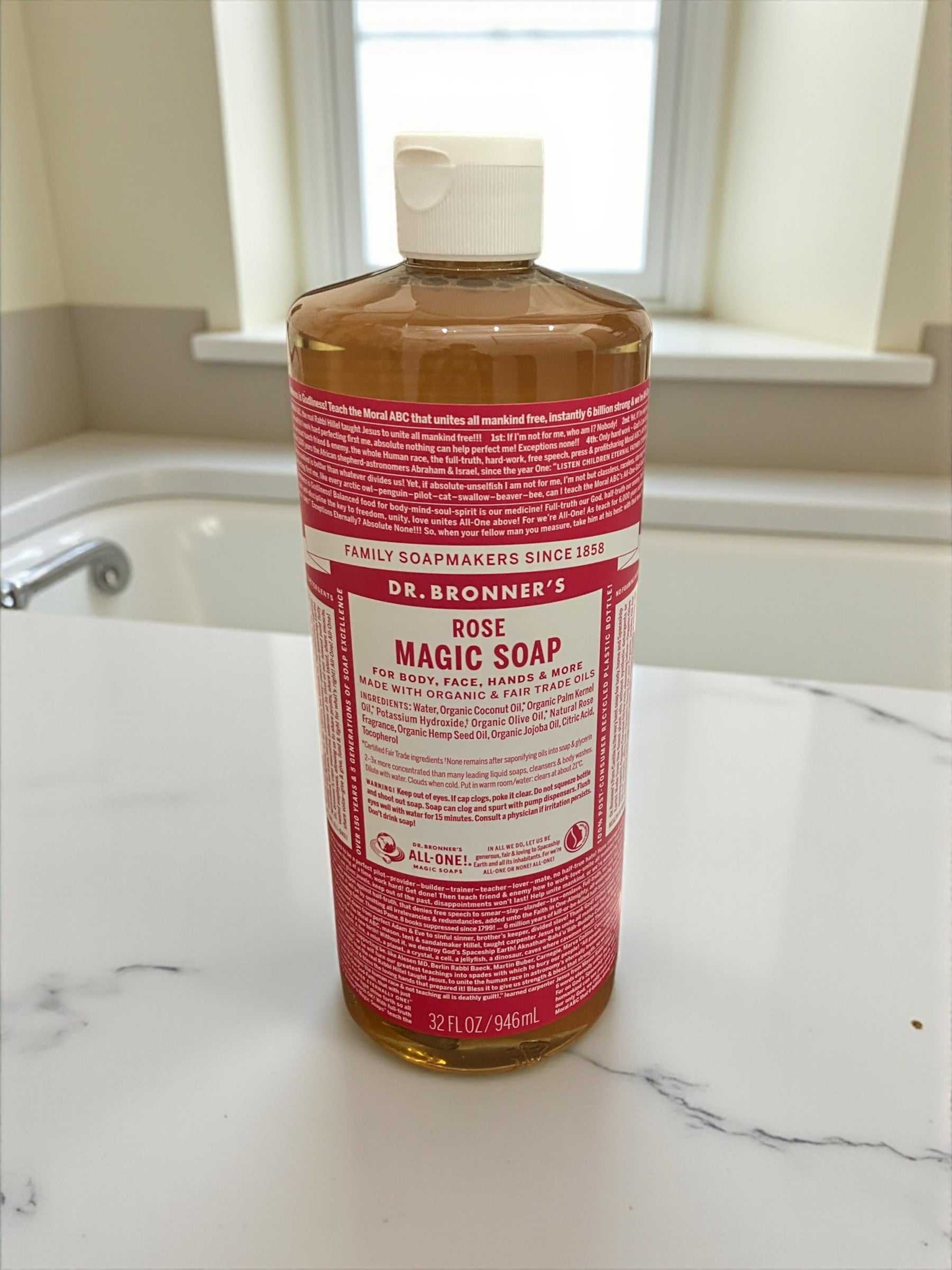 ドクターブロナー マジックソープ ローズは、顔からボディまで全身に使える多機能オールインワンソープです。無農薬有機栽培のオーガニック植物のみを厳選し、天然由来成分100%で構成。合成界面活性剤や合成保存料、合成着色料などの化学添加物を一切使用していないため、肌への優しさが特徴です。天然エッセンシャルオイルから生まれたローズの香りが、毎日のケアを心地よく彩ります。大容量946mlで経済的。シンプルで安全な成分設計だからこそ、敏感肌の方にも安心してお使いいただけます。
