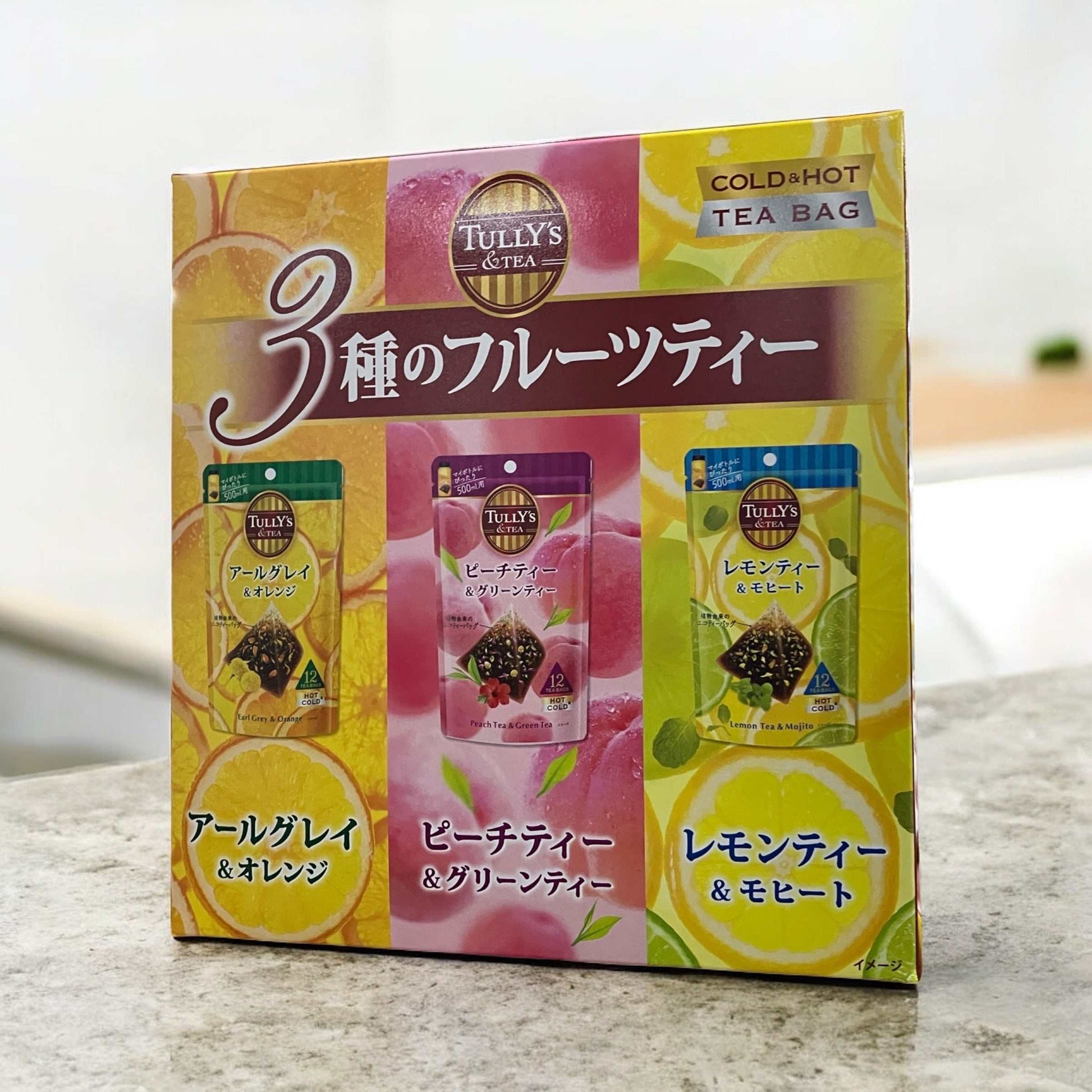 TULLY'S & TEAのフルーツティー3種アソートは、アールグレイ&オレンジ、ピーチティー&グリーンティー、レモンティー&モヒートの爽やかな組み合わせ。各フレーバー2袋入りで計72袋がセットになっており、お湯でも水でも簡単に抽出できます。日常のリラックスタイムやおもてなしに、豊かな香りとフルーティーな味わいをお楽しみください。