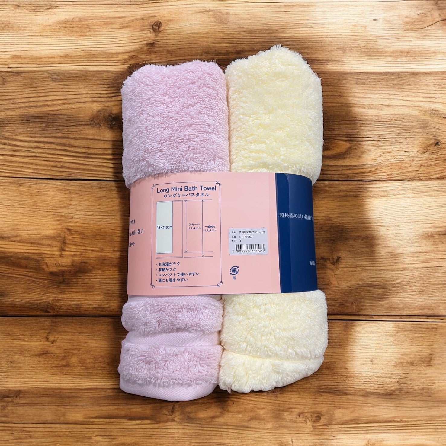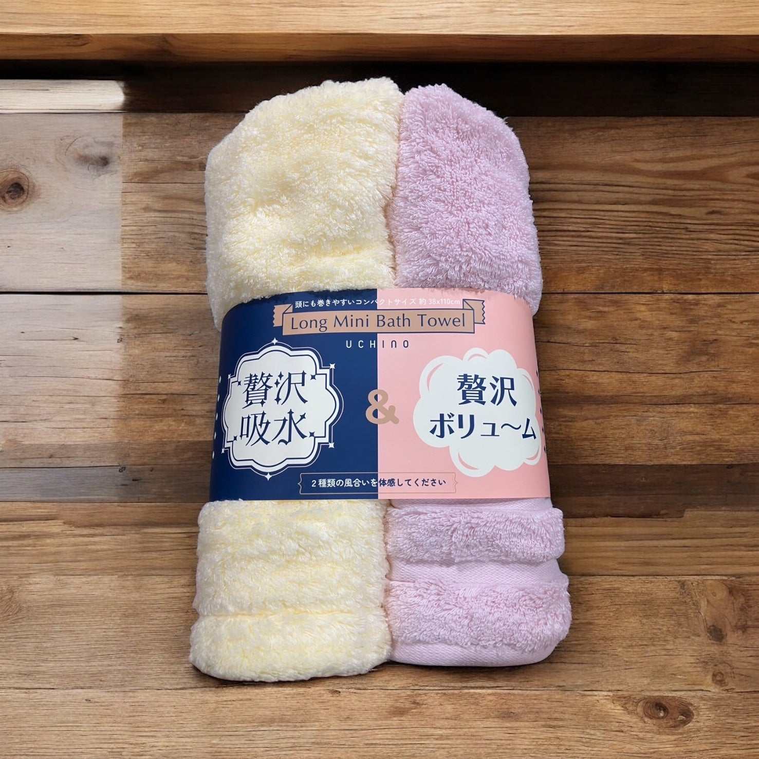 UCHINOの贅沢タオル2枚セットは、異なる風合いのタオルをお楽しみいただけます。ひとつは撚りの無い超長綿の無撚糸を使い、柔らかく肌への刺激を抑えつつ優れた吸水力を実現。もうひとつは中空糸を用い、軽やかでボリューム感のあるしっかりした手触りが特徴です。サイズは使いやすい38×110cmのロングミニバスタオルで、洗濯や収納も簡単。日常の快適さと上質な使い心地を両立したタオルセットです。