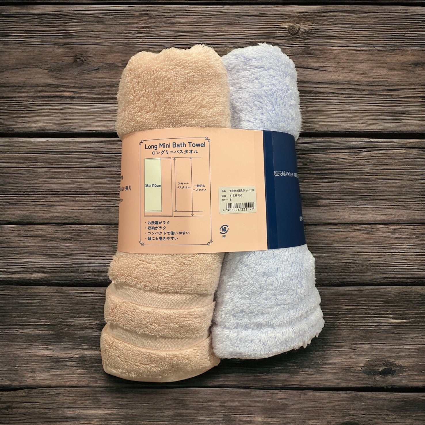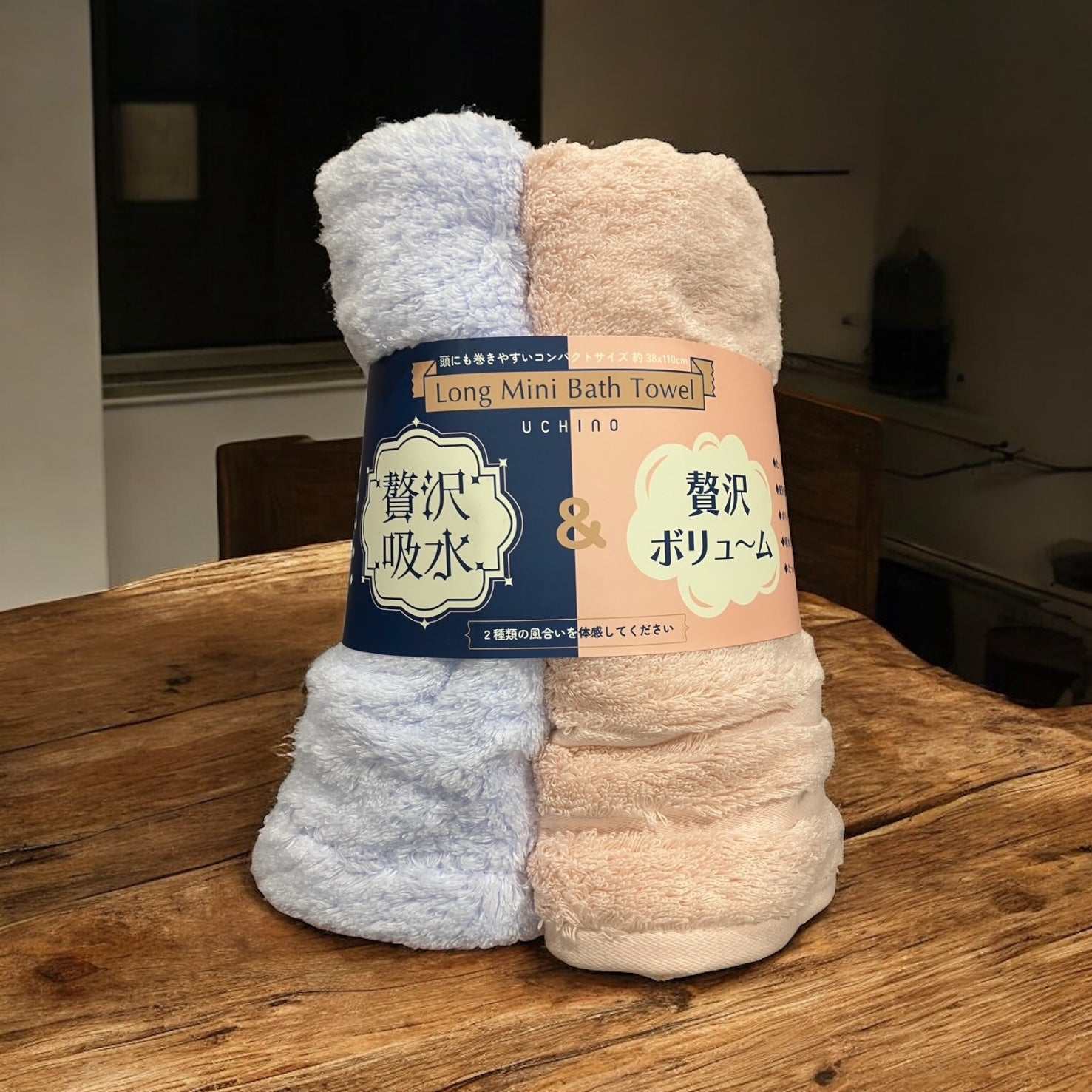 UCHINOの贅沢タオル2枚セットは、異なる風合いのタオルをお楽しみいただけます。ひとつは撚りの無い超長綿の無撚糸を使い、柔らかく肌への刺激を抑えつつ優れた吸水力を実現。もうひとつは中空糸を用い、軽やかでボリューム感のあるしっかりした手触りが特徴です。サイズは使いやすい38×110cmのロングミニバスタオルで、洗濯や収納も簡単。日常の快適さと上質な使い心地を両立したタオルセットです。
