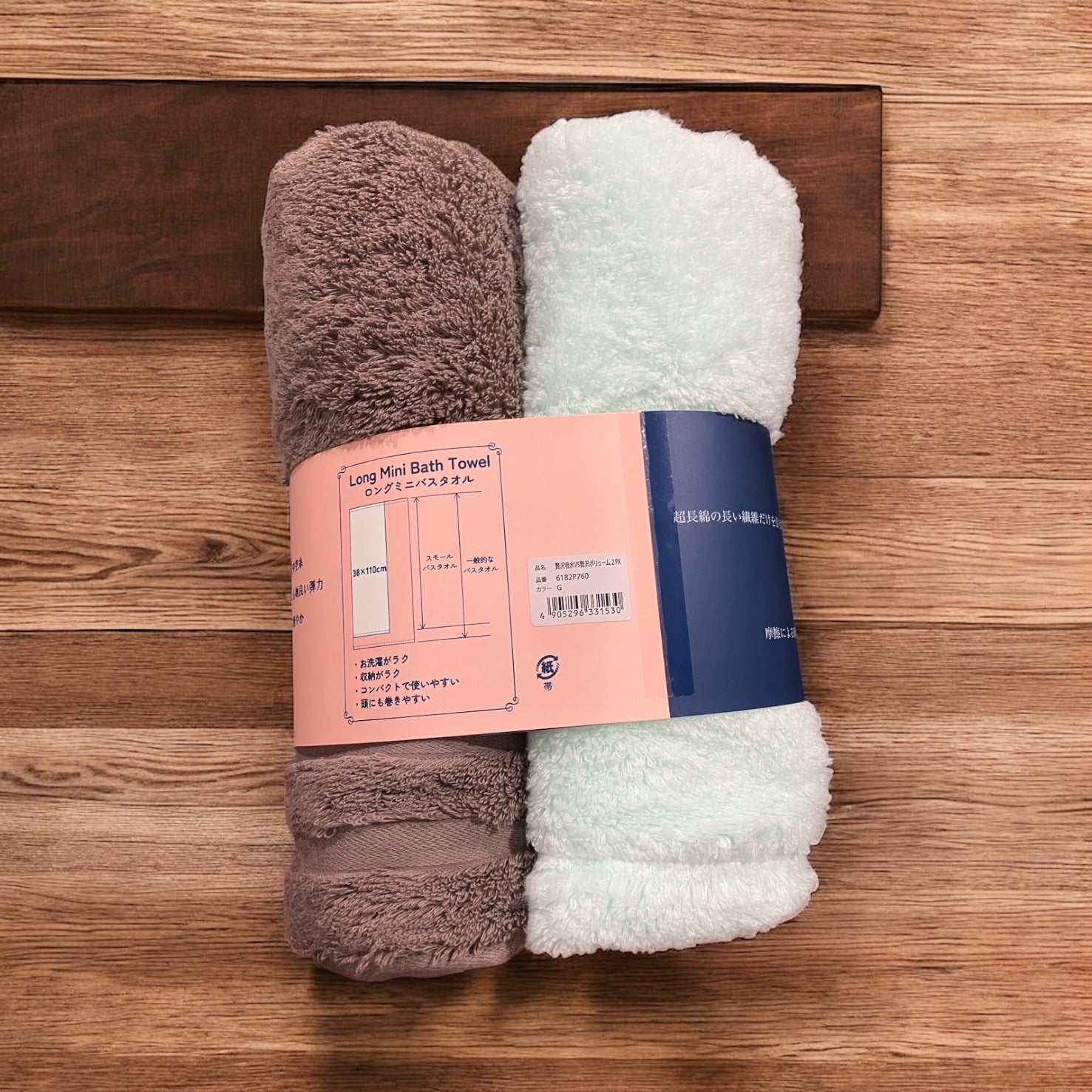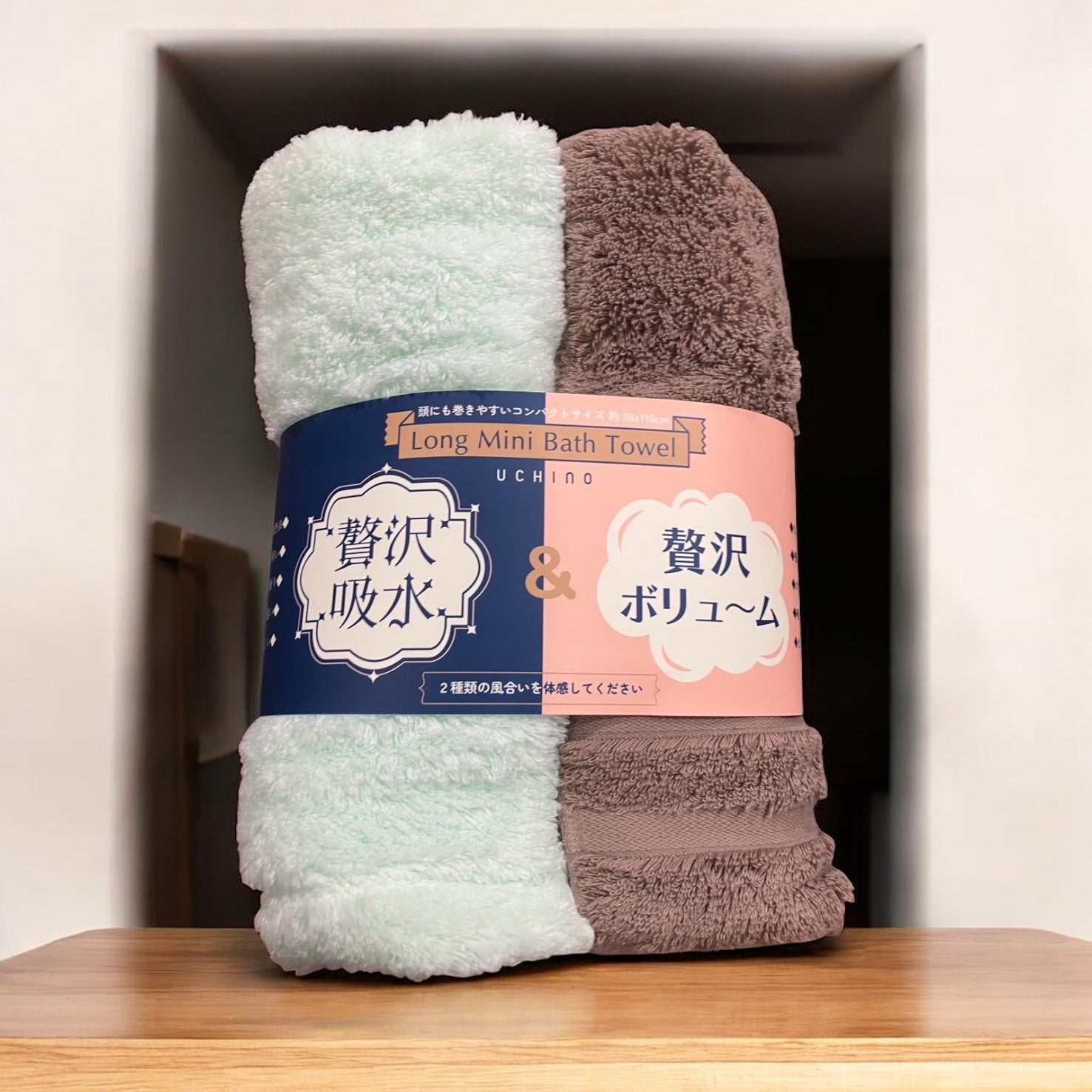 UCHINOの贅沢タオル2枚セットは、異なる風合いのタオルをお楽しみいただけます。ひとつは撚りの無い超長綿の無撚糸を使い、柔らかく肌への刺激を抑えつつ優れた吸水力を実現。もうひとつは中空糸を用い、軽やかでボリューム感のあるしっかりした手触りが特徴です。サイズは使いやすい38×110cmのロングミニバスタオルで、洗濯や収納も簡単。日常の快適さと上質な使い心地を両立したタオルセットです。